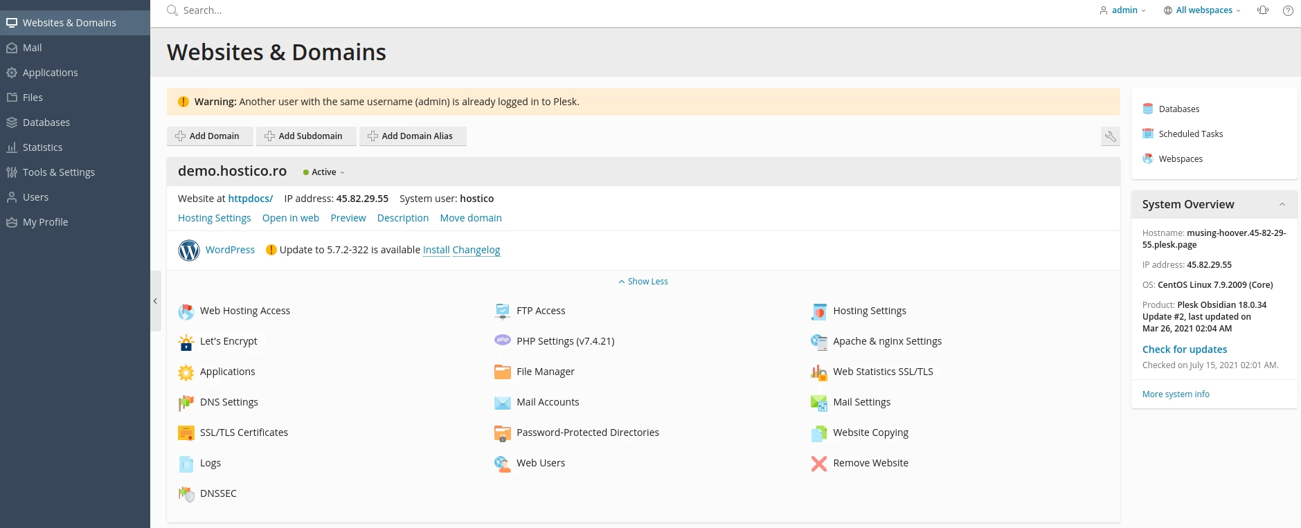 - If the authentication process was successful, the Plesk control panel page for the respective hosting will open.