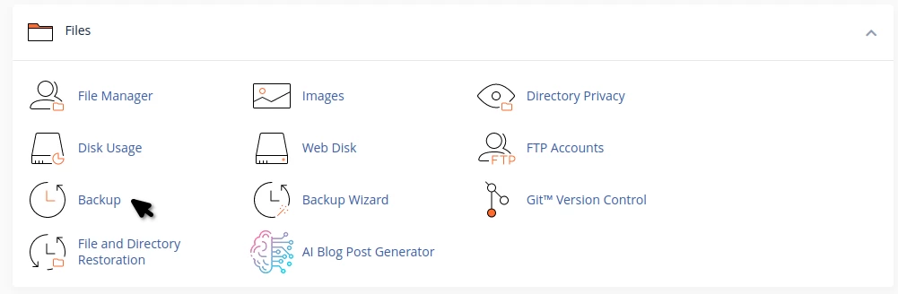 - After logging into the cPanel control panel, in the FILES section, we will access the Backup plugin